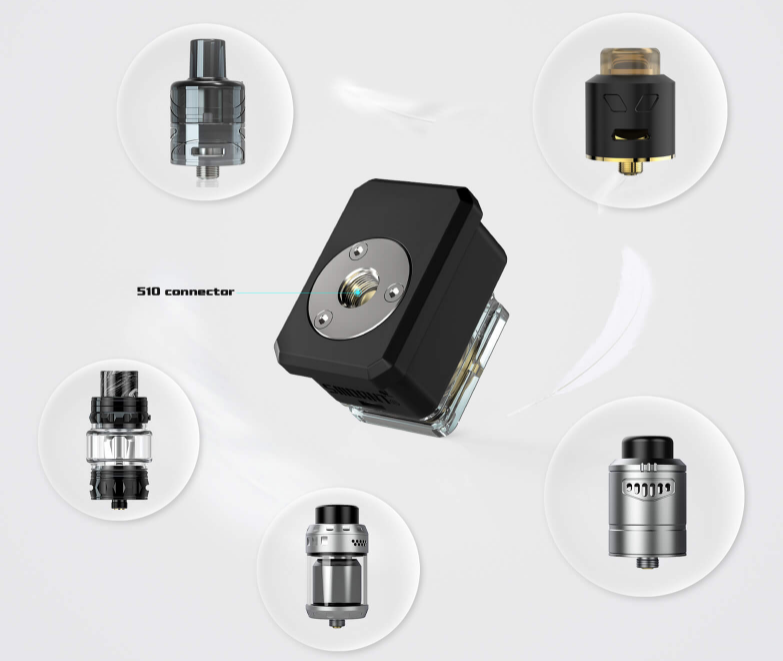 Производитель предусмотрел замену картриджа на специальный адаптер для установки стандартных атомайзеров с 510-м коннектором, благодаря чему Smoant Pasito 2 kit превращается в полноценный небольшой бокс-мод, рассчитанный на установку баков и дрипок диаметром до 26 мм.